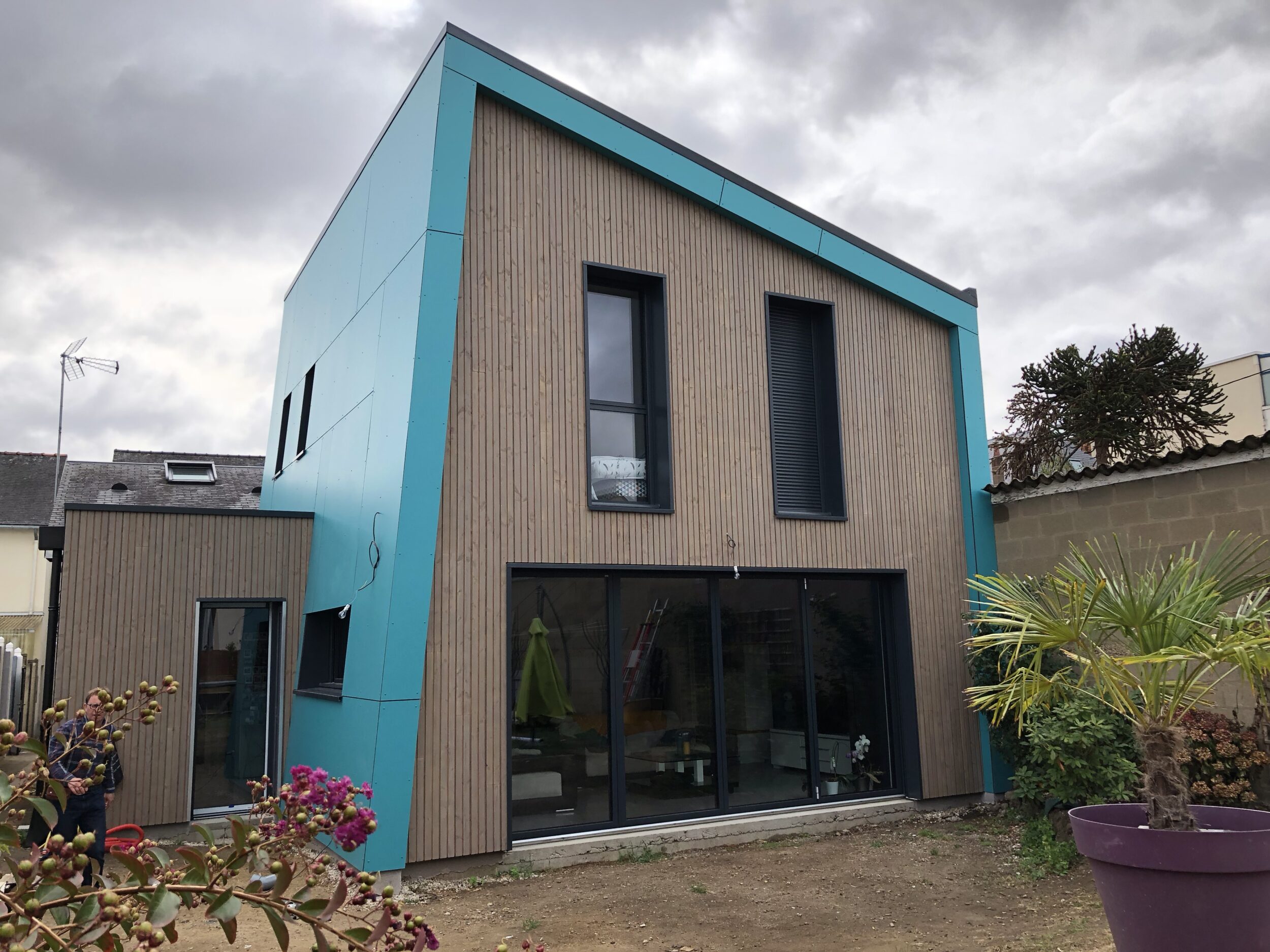 Un volume vitré avec une façade toute vitrée et orientée vers une belle exposition et avec une vue sur la rivière traversant la ville. Dans le prolongement, une terrasse suspendue et orientée en tenant compte de l'inclinaison de la façade de la maison voisine permettant de faire le lien entre les deux constructions.