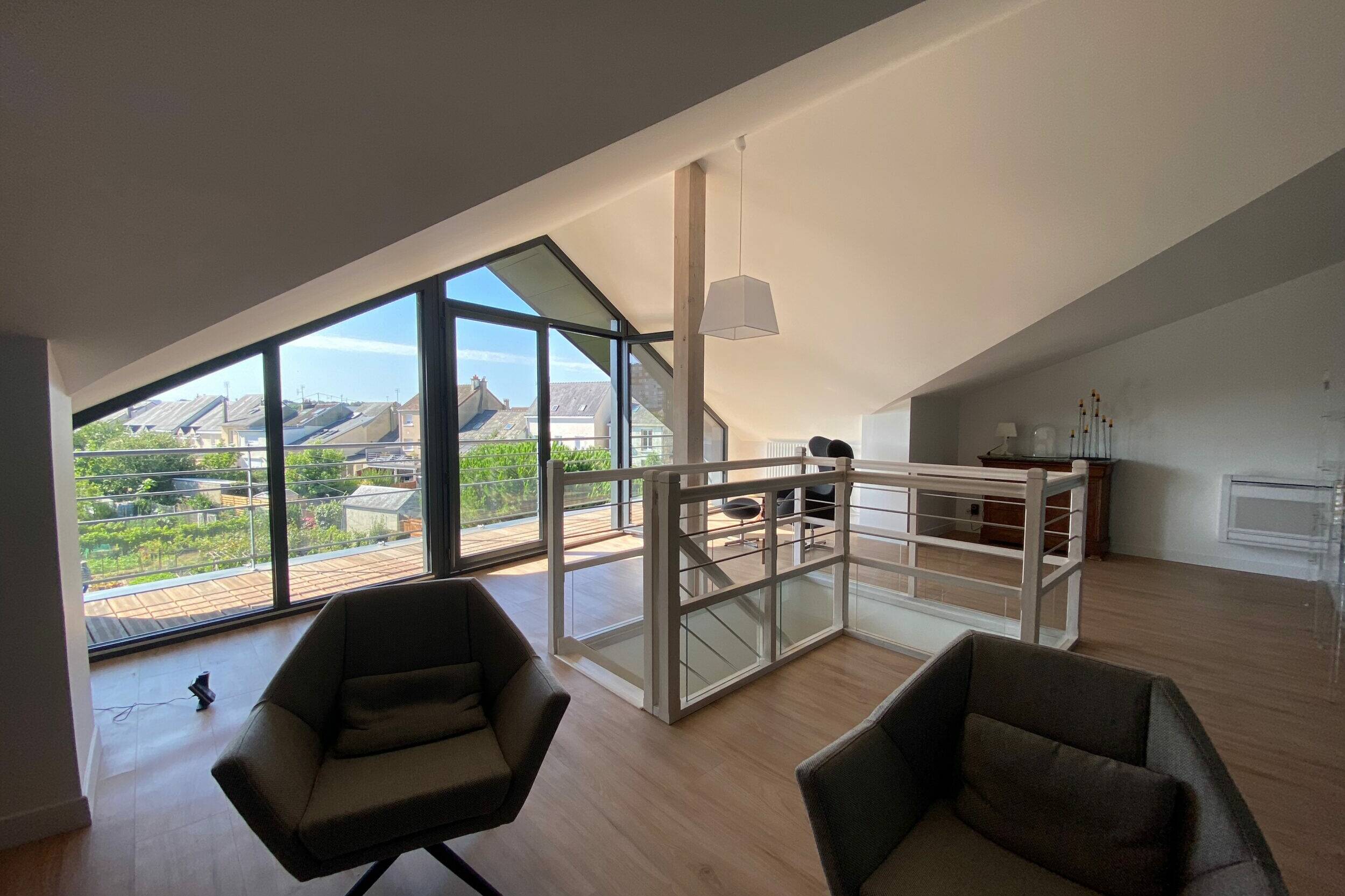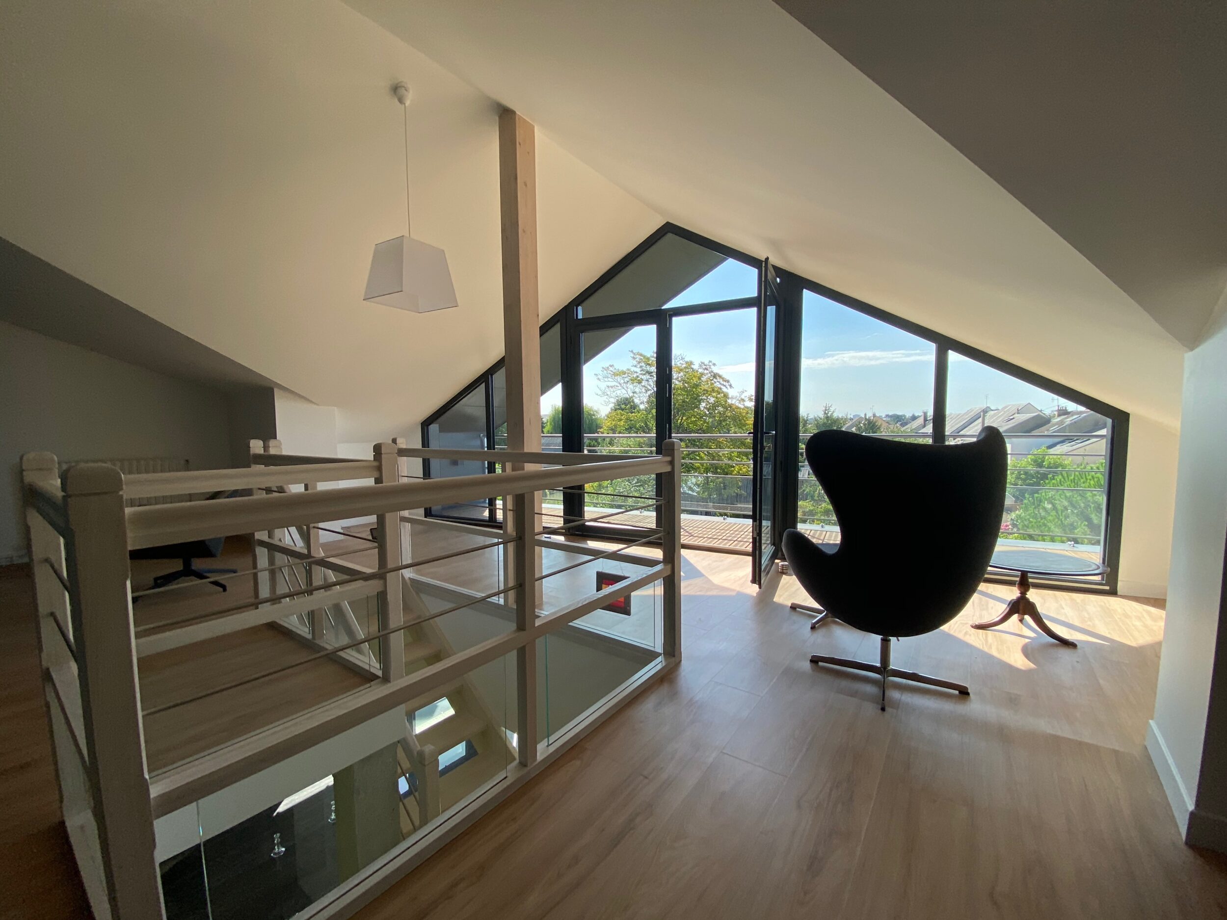Le petit plus, un balcon à l'étage permettant de profiter encore plus de la vue et permettant de créer un auvent pour la protection solaire. Au RDC, un bel auvent laqué permettant la protection solaire de la grande baie.