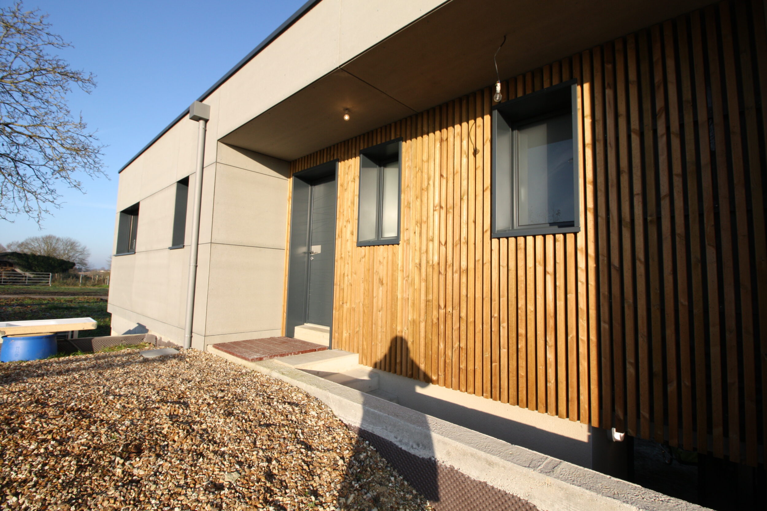Pour palier à cette contrainte, l'architecture de la maison a tout de suite trouvé son sens. Vous remarquerez deux volumes bien distincts. Un premier à toit plat exposé SUD et un second monopente. Cette différence de volume et de hauteur entre les deux permet justement l'entrée de la lumière du SUD dans la pièce de vie.