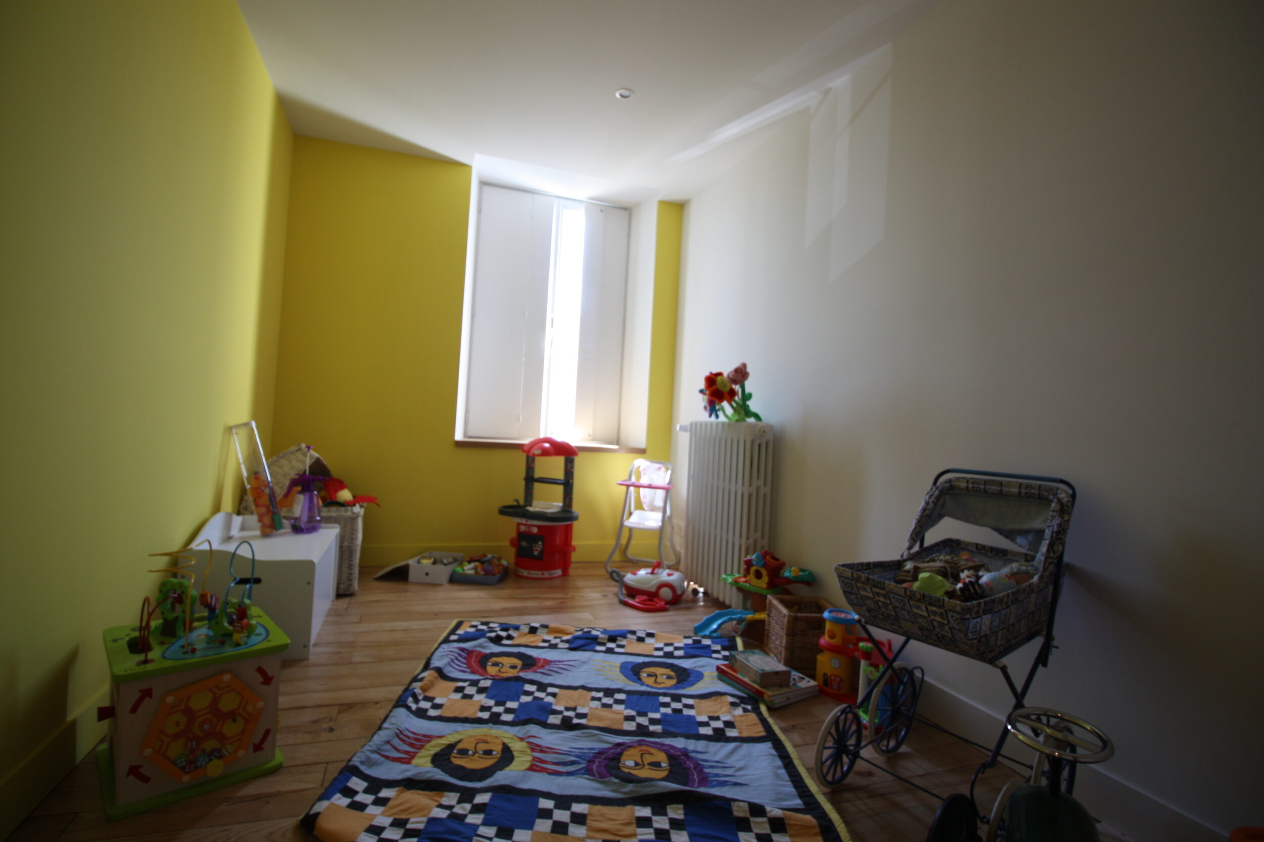 Premier Étage, Un palier avec à droite ( quand nous arrivons en haut de l'escalier ) deux chambres dont une salle de jeux. Quasi en face, la salle de bains des enfants, et à gauche, les WC, une lingerie et une 3ème chambre.