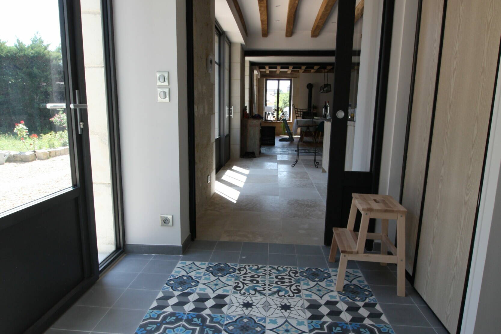 Ne seraient-ce pas des carreaux ciment ? Et bien OUI !! Après plusieurs tests de calepinage pour définir parfaitement l'emplacement de chaque pavé, le résultat est très soigné et la répartition plutôt réussie, qu'en pensez-vous ?